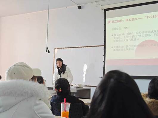 在核心要义解读环节,支部书记刘艳霞同志以“155356112124”数字化框架为抓手,逐层拆解“十五五”历史方位、“三个坚持”、“五个以”指导原则及六大发展原则。她结合研究生党员的科研学习实际举例阐释,引导大家深刻理解“以改革创新为根本动力”的内涵要求,现场党员们结合自身研究方向展开热烈讨论,学习热情持续高涨。