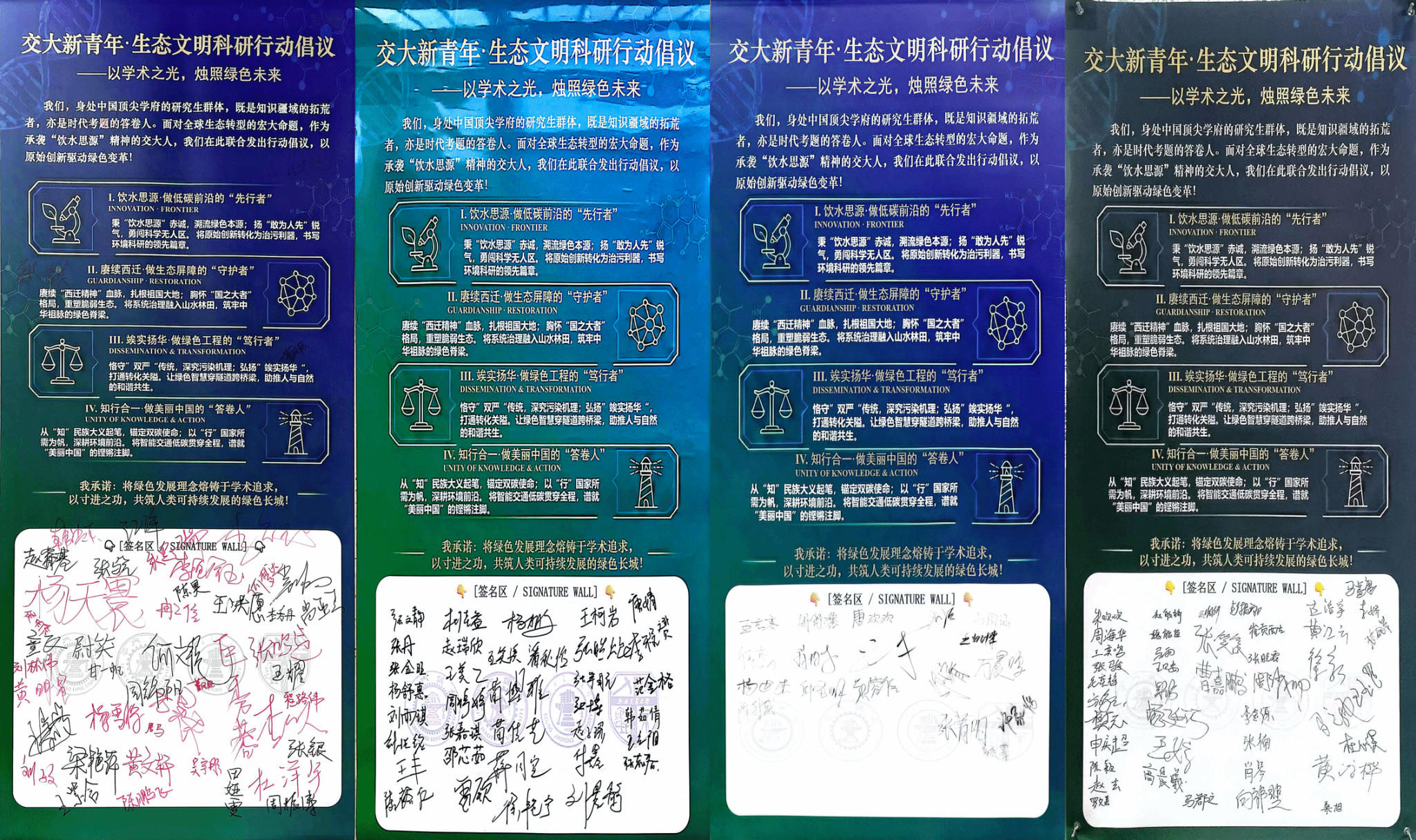 随后,四校学生党员代表云端签署《交大新青年·生态文明行动倡议》。该倡议是青年学子对时代命题的积极回应,亦融合了四所交通大学同源共脉、各具特色的精神传承。未来,四校环境学科党支部将进一步打破校际壁垒,推动从“单兵作战”向“集团协同”的转变,为构建绿色发展新格局持续贡献交大智慧与青春力量。