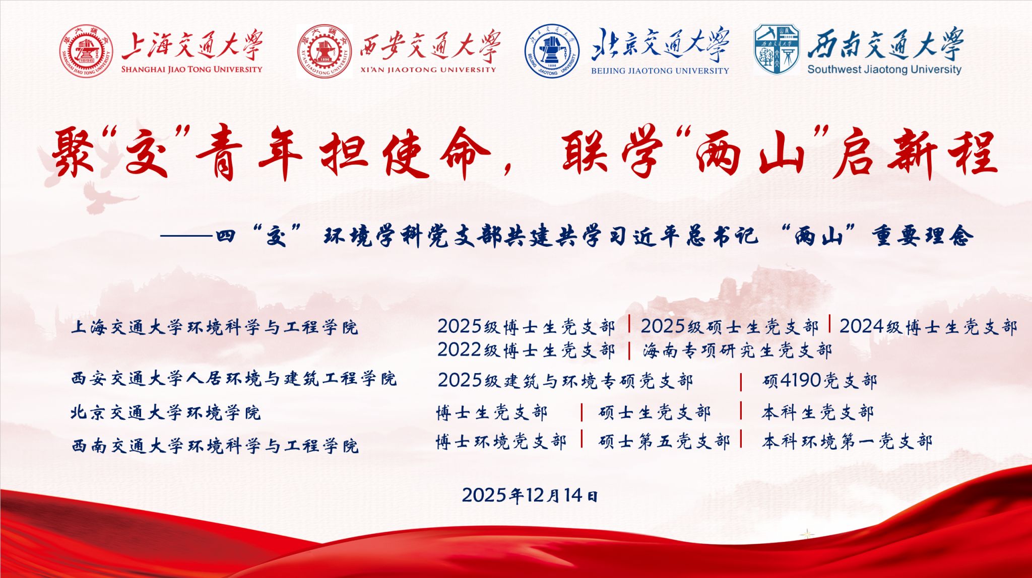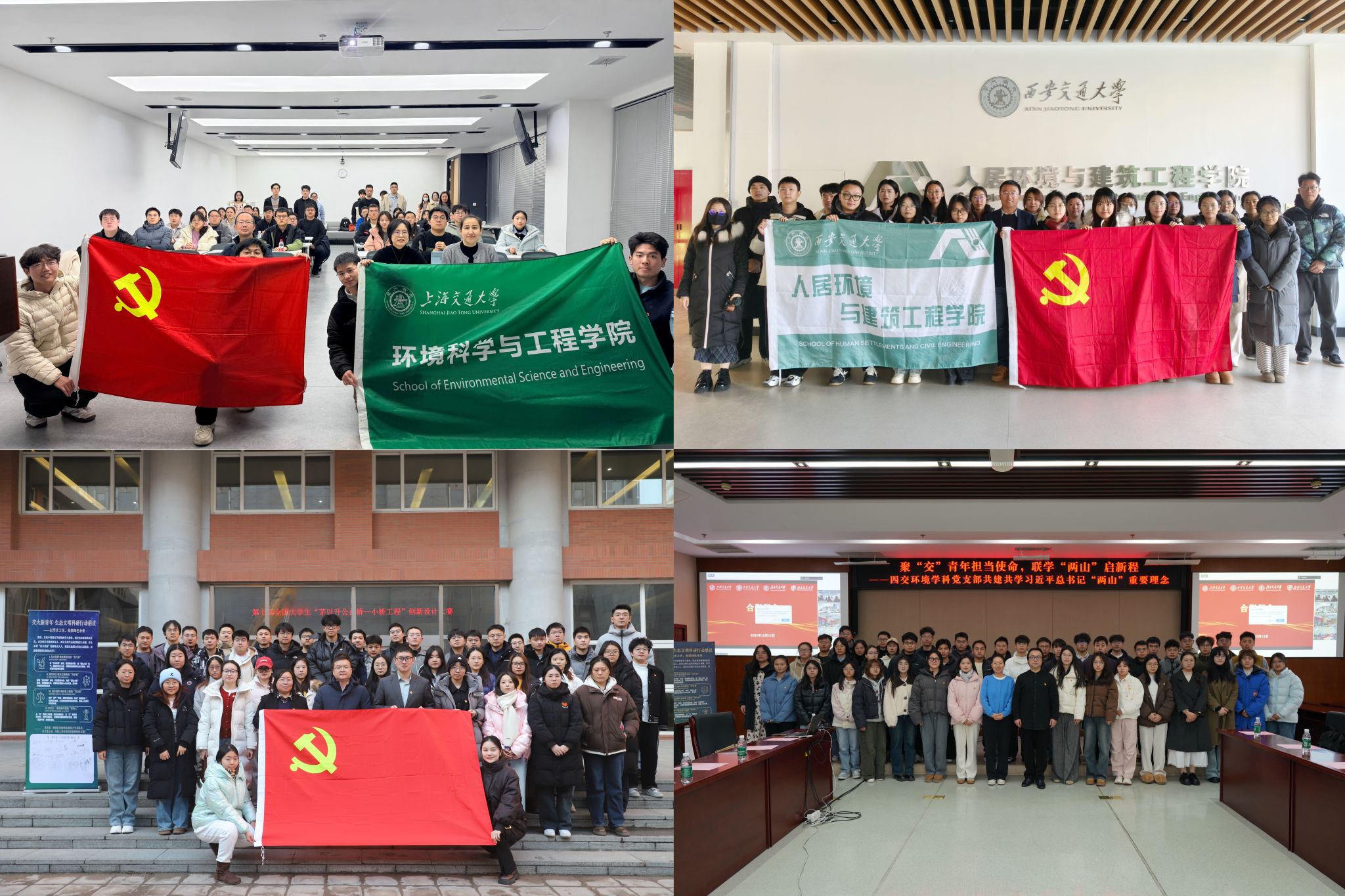 本次“聚‘交’青年担使命,联学‘两山’启新程”主题党日活动,以交通大学130周年校庆为契机,以“两山”理念为指引,搭建了四校环境学科党建交流与协同育人的重要平台。展望未来,四校将持续深化联学共建,将交大精神切实融入建设美丽中国的时代使命,引导学生党员在科研攻关与生态治理中挺膺担当,在生态治理中积极作为,以专业能力与实际行动,为建设美丽中国注入坚实的交大力量。