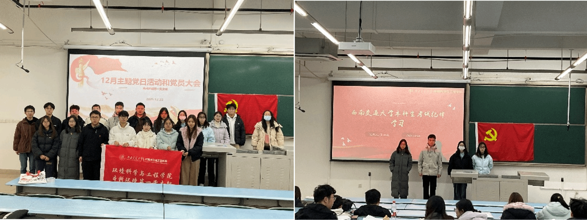 本科环境第一党支部于犀浦校区X2218教室,围绕“学习宣传贯彻党的二十届四中全会精神”与“强化期末学风建设”两大主题,组织开展十二月主题党日活动。活动旨在引导支部党员深刻把握国家发展大政方针,同时筑牢诚信应考的思想防线、严守纪律底线,切实发挥学生党员在思想引领与学风建设中的表率作用。