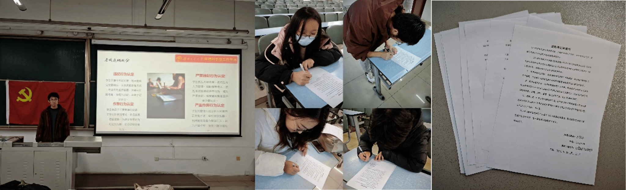 本科考试考场管理办法》等规章制度。通过典型案例剖析和纪律知识解读,明确违纪作弊行为的严重性和后果,进一步强化了诚信应考的规则意识与底线思维。会上,支部党员共同签署了《诚信考试承诺书》,并承诺将以身作则,带头维护公平、公正的考试环境,积极影响和带动身边同学共同践行诚信承诺,营造风清气正的期末备考氛围。