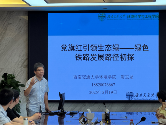 活动伊始,SeedHub 教工党员贺玉龙教授以《党旗红引领生态绿——绿色铁路发展路径初探》为题作主题分享。贺教授立足生态文明建设的时代背景,深入阐述了将绿色发展理念融入交通强国战略的重要意义。强调以绿色技术为支撑,在保障铁路运输安全高效的同时,降低对生态环境的负面影响,推动铁路行业可持续发展。贺教授的分享拓展了绿色铁路发展研究的新视野,明确了党建引领下生态与交通融合发展的实践路径。