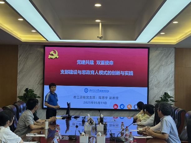 随后,交通运输与物流学院教工运输党支部书记陶思宇副教授以《党建共建 双重使命:支部建设与思政育人模式的创新与实践》为题,进行了专题分享。陶教授立足教工运输党支部建设的实践经验,系统介绍了支部建设的成果与特色举措,并深入阐述了交通运输与物流学院“两横三纵一合力”育人体系模式的创新理念与实践探索。结合“双带头人”的工作经历,为各学院党支部在结对共建以及党建与业务深度融合方面提供宝贵的经验借鉴,进一步拓展了党支部在党建引领下的育人工作思路。