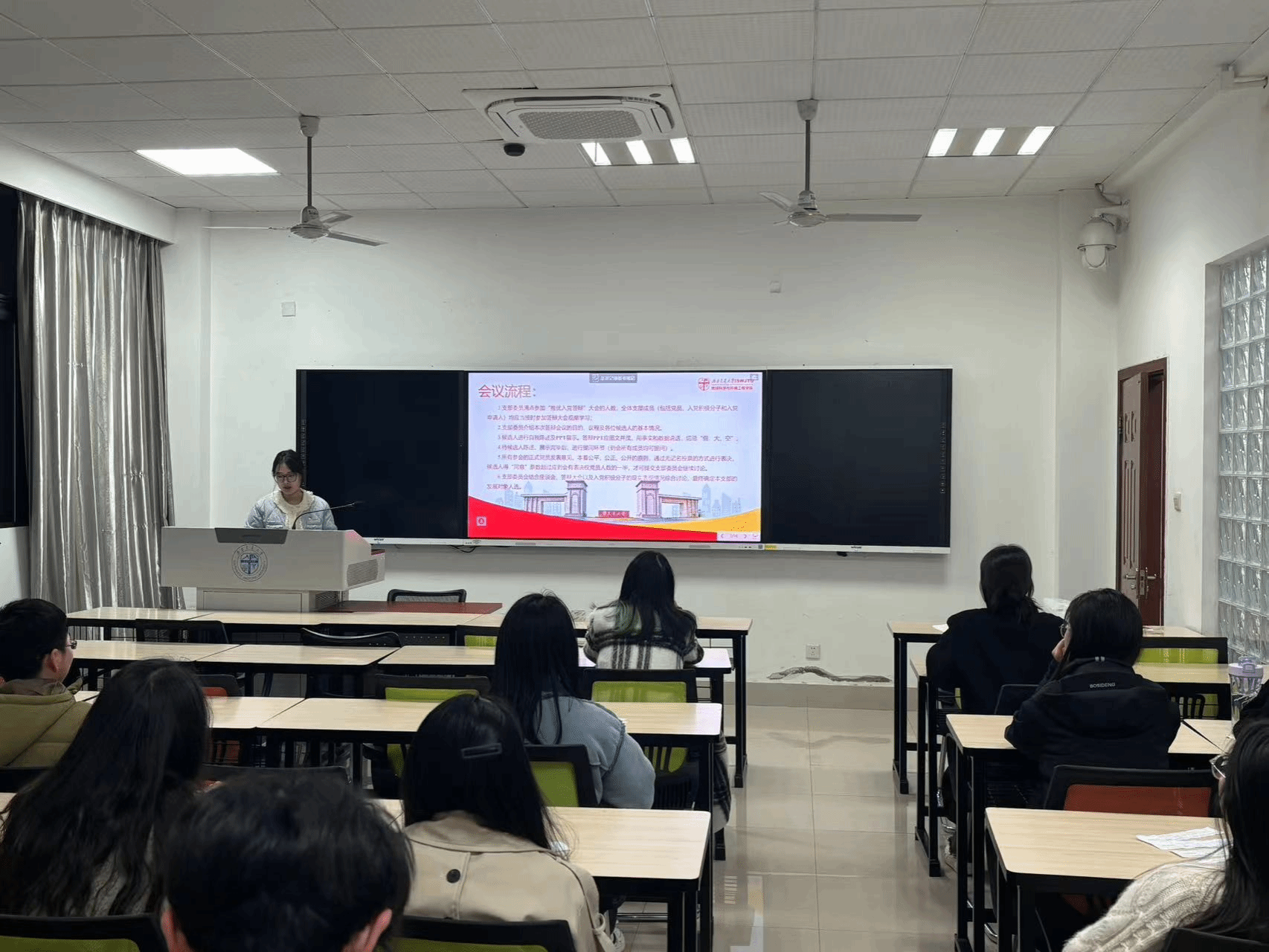 会议开始前,陈春荧同志清点了参加答辩会的人数,支部有正式党员11名,预备党员2名,本次大会的到场人数为正式党员8人,预备党员2人,正式党员出席超过半数,满足大会开启的先决条件。会议的议题是讨论关于接收林鹏、唐玥、杜明辉和龚姝月4名入党积极分子为发展对象人选的问题。