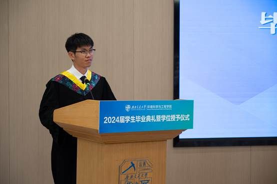2020级本科生、竢实扬华奖章获得者林朝标同学作为毕业本科生代表发言。首先,他感谢母校和学院各位老师的辛勤栽培。随后他深情回顾了四年的大学生活,从初识环境专业的困惑与个人的积极求索,再到团队协作促进共同成长奋进,四年的时光使他从稚嫩的学生成长为有理想、有担当的青年。面对未来,林朝标同学深知作为环境学子任重道远的责任与使命,他也将致力于探索环境污染解决之道,身体力行、久久为功,为美丽中国建设贡献自己的力量。