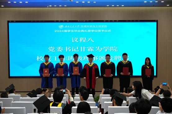 学院院长龚正君教授、学院党委书记甘霖等学院领导和老师上台为本科、硕士毕业生颁发学位证书,拨穗正冠,并合影留念。
