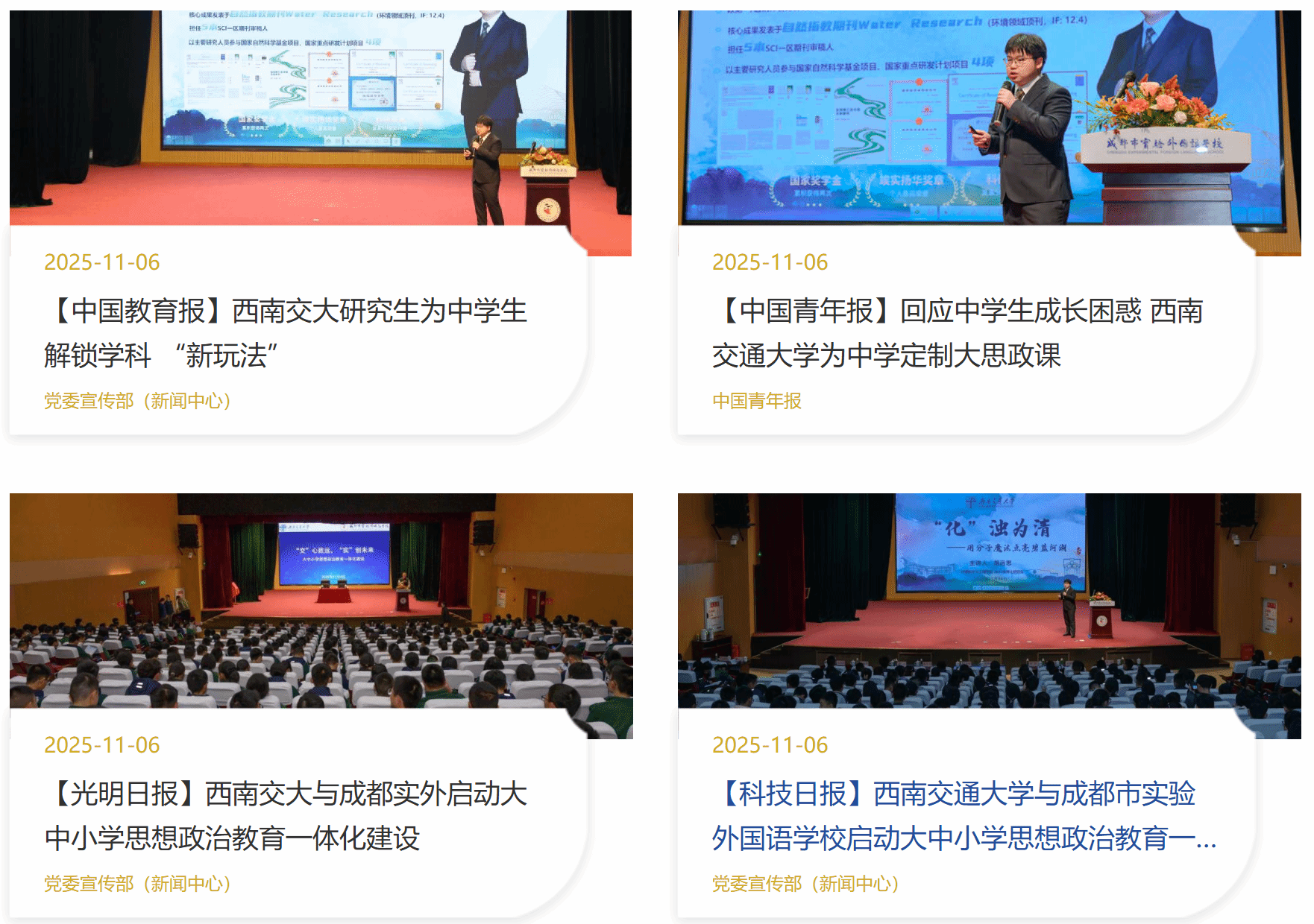 此次两校共建课程围绕“专业认知、学科衔接、生涯探索”三大维度,涵盖多门学科。胡远思主讲的《“化”浊为清》课程,作为环境科学领域的示范课例,成功实现了大学科研深度与中学认知广度的有机融合,成为系列课程中的亮点。中国教育报评价该活动为“一场高校与中学的‘双向奔赴’,让台下台上的学生都从中获益”,活动还获光明日报、中国青年报、科技日报等主流媒体广泛关注。