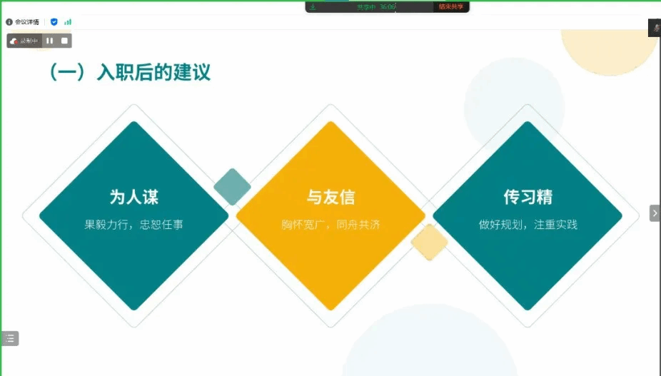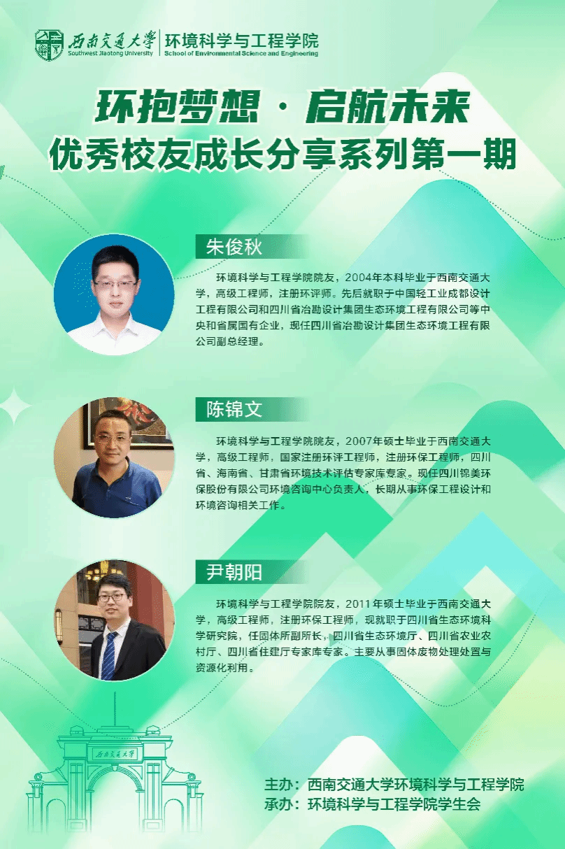 ,现任四川省冶勘设计集团生态环境工程有限公司副总经理。朱俊秋学长从就业方向、专业类型、就业形势等方面展开分享,详细分析了现阶段环境行业的良好发展势头和前景,并向同学们提出了以下三点期望:为人谋,要果毅力行、忠恕任事;与友信,要胸怀宽广、同舟共济;传习精,要做好规划、注重实践。
