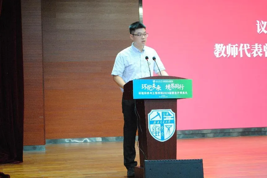 曾卓作为教师代表发言,他从学科的角度讲述了环境专业的学习目标、意义以及未来发展,鼓励新生在求学期间不仅要学习专业知识,更要学习如何为人,培养正确的价值观和人生观,做到知行合一。
