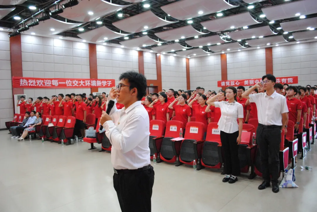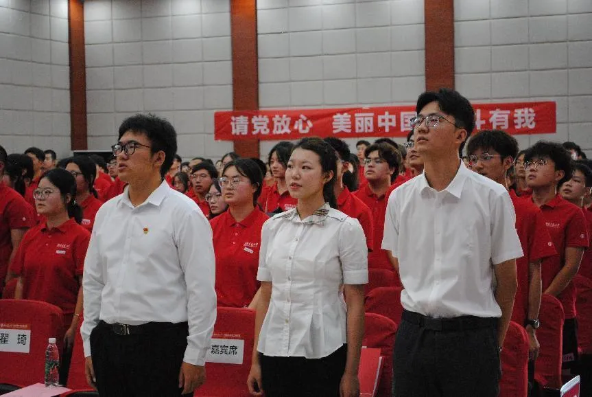 学生会主席向祎斐同学带领全体同学宣誓。勤奋学习,锐意进取。新生们用铿锵有力的誓词展现了他们投身美丽中国建设的决心和担当。