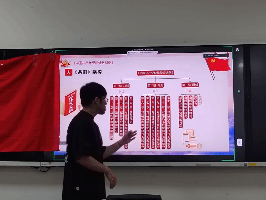为认真贯彻落实党中央和上级党委关于开展党纪学习教育的工作部署,进一步增强党员干部纪律意识,提高党性修养,强化政治担当,2024年5月16日19:30,研22级环境第二党支部于X4127教室开展主题党日活动,围绕新修订的《中国共产党纪律处分条例》(以下简称《条例》),专题学习党的工作纪律、生活纪律。会议由支部书记邱建宏主持。