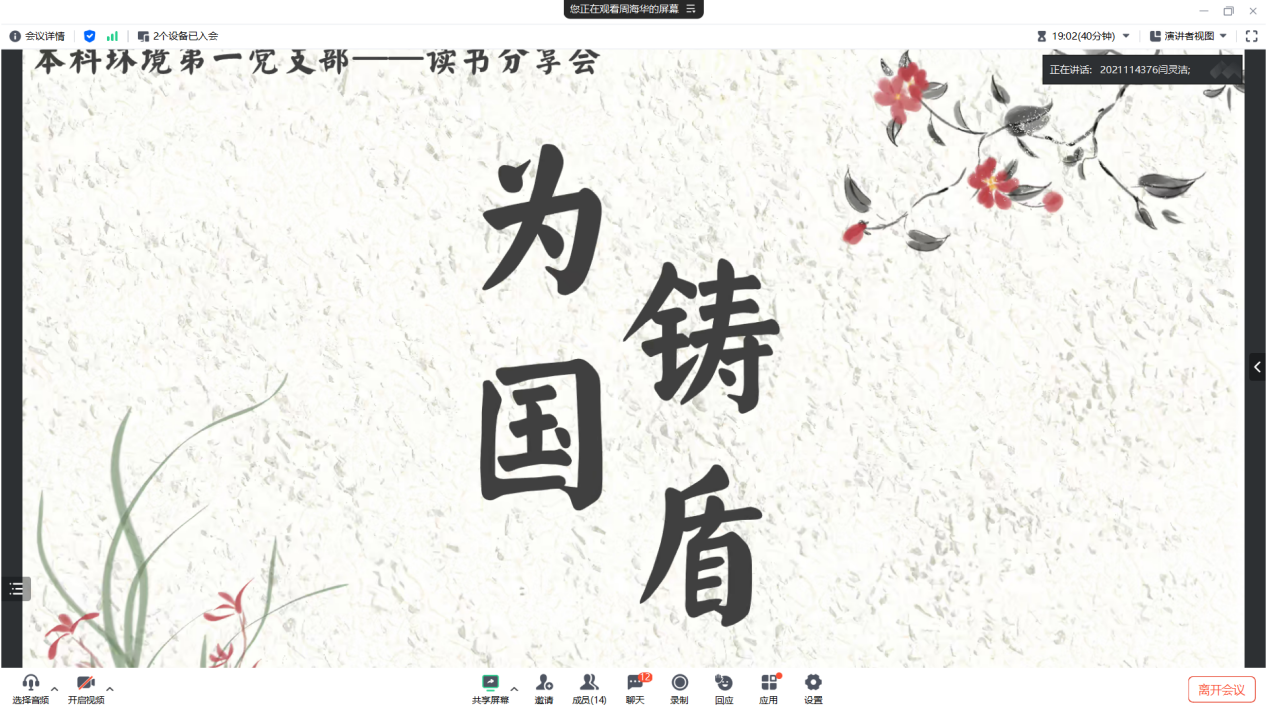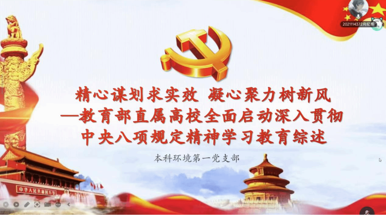 2025年5月15日19:00本科环境第一党支部在线上开展读书分享会和5月党日活动。本次党日活动的主题为学习中央八项规定。本次活动由党支部书记闫灵洁同志主持并领学。