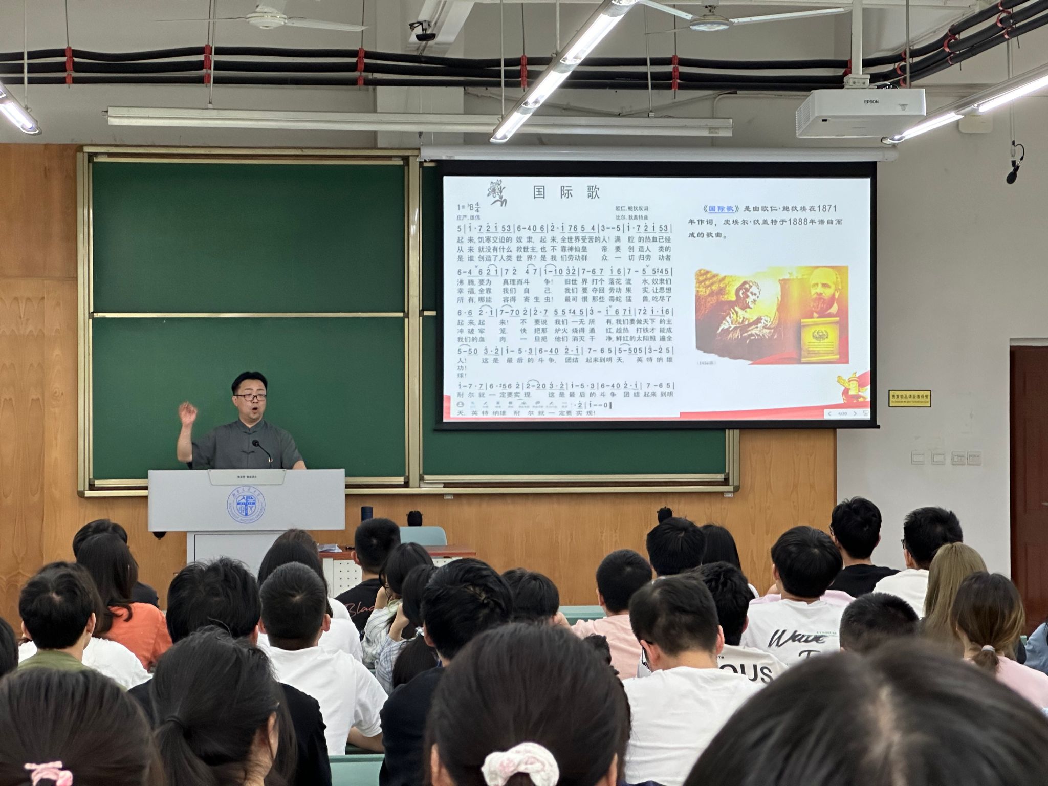 随后,学院党委书记甘霖为全院学生党员讲授了一节别开生面的音乐党课《为真理而斗争》。甘书记精选《国际歌》等七首红色歌曲,用激昂的歌声讲述革命故事,让同学们在歌声中重温党的光辉历程。随着《国际歌》的旋律,甘书记带领大家穿越历史的烟云,感受共产主义先烈们的英勇与坚韧。《三大纪律八项注意》、《过雪山草地》、《红军不怕远征难》等歌曲,让同学们更加深刻地理解党的纪律与信念。而《我的祖国》、《祖国不会忘记》则唤起了大家心中对祖国的深深眷恋与自豪。